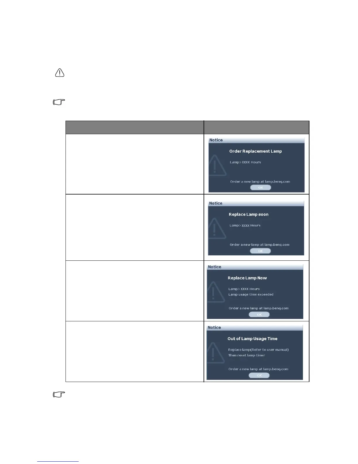 The Lamp indicator light and Temperature warning light will light up if the lamp becomes too