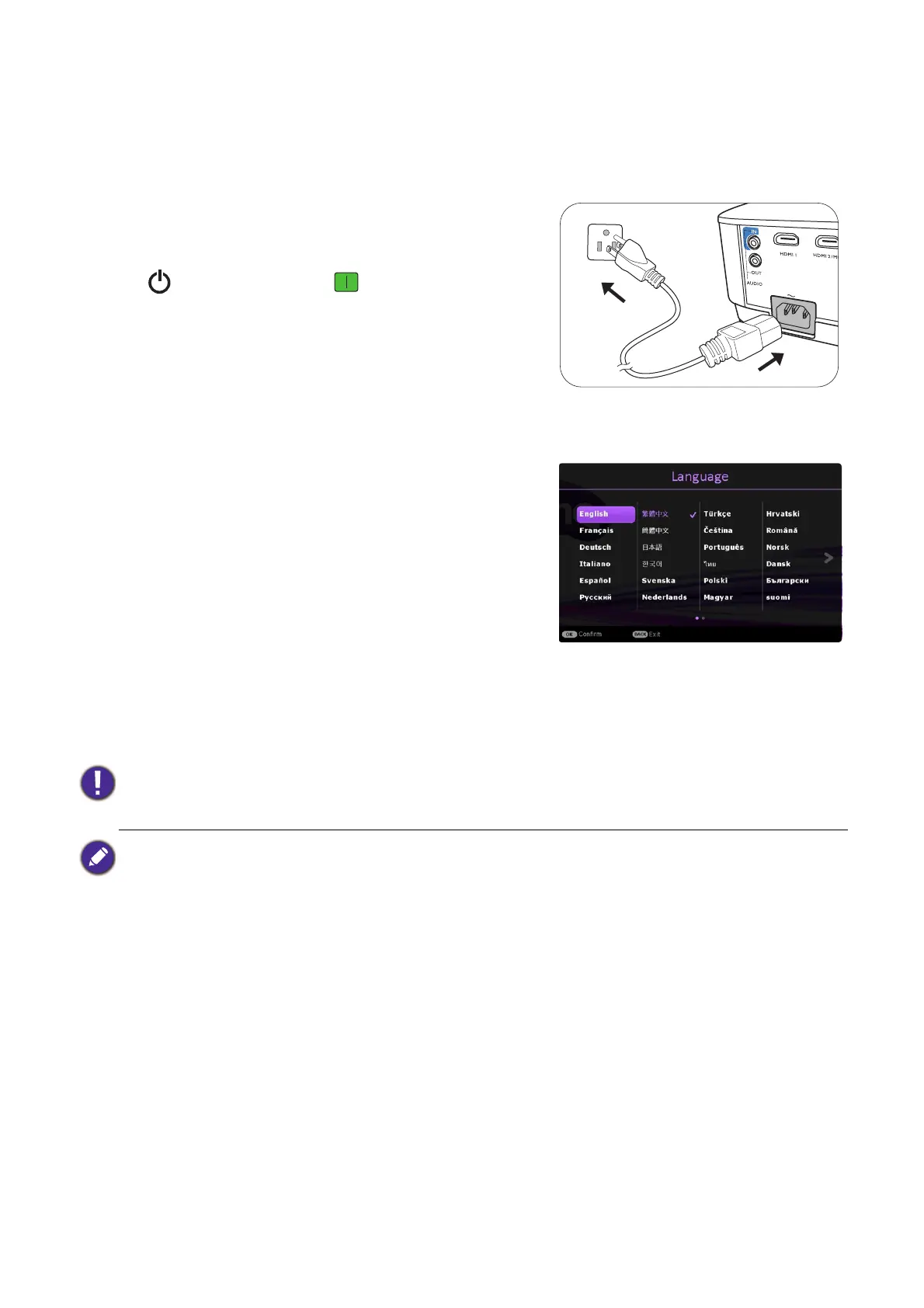• If the projector is still hot from previous activity, it will run the cooling fan for approximately 90 seconds before