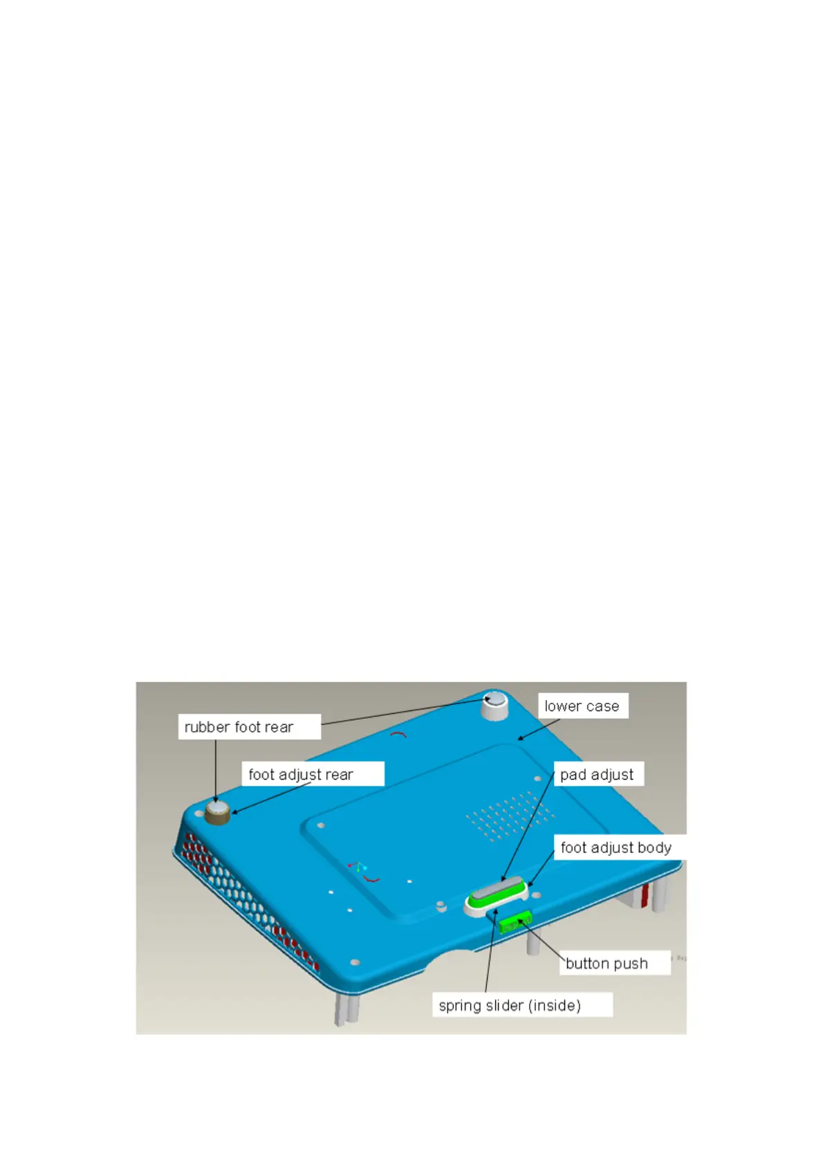 1-1 Insert the rubber foot rear 、foot adjust rear on the lower case.