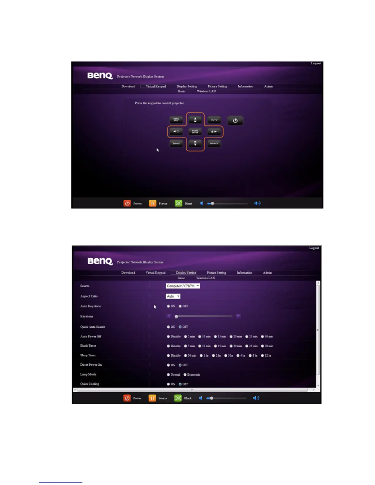 4. The Virtual Keypad page displays a virtual keypad with which you can control the
