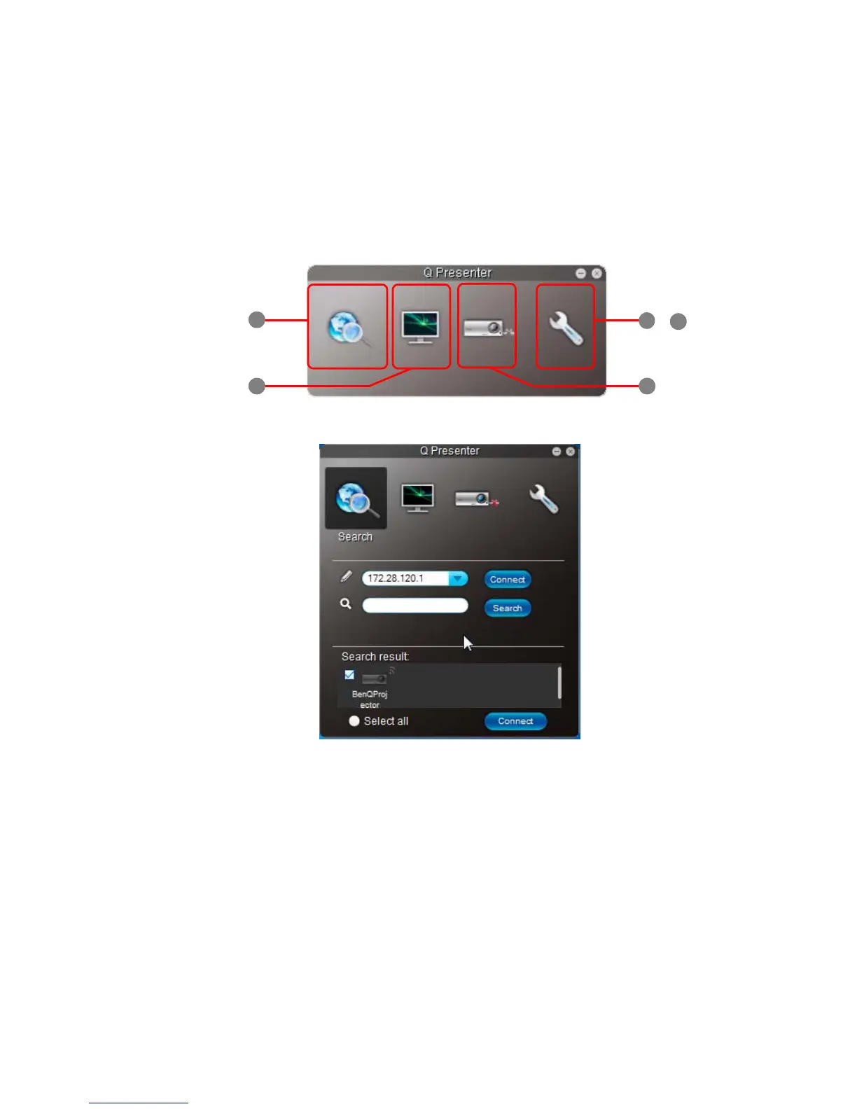 1. The Search page allows you to search and connect to a projector.