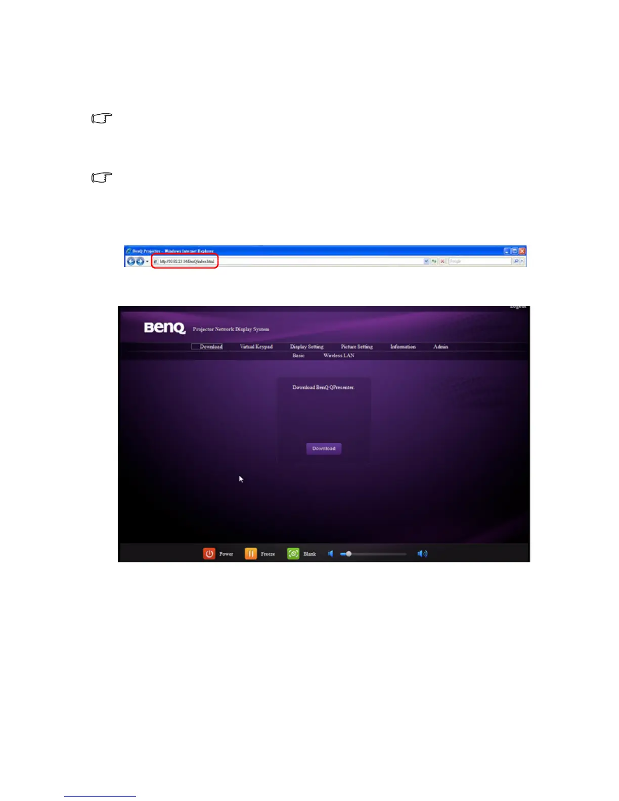 1. Enter the address of the projector in the address bar of your browser and press
