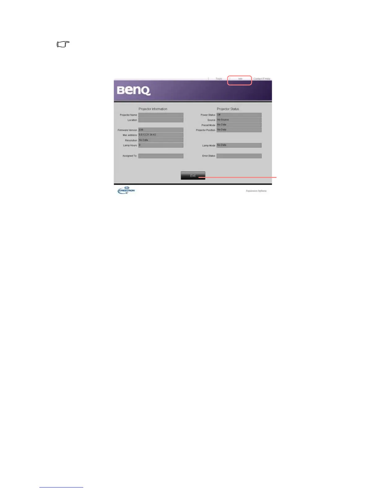 The info page displays the information and status of this projector.