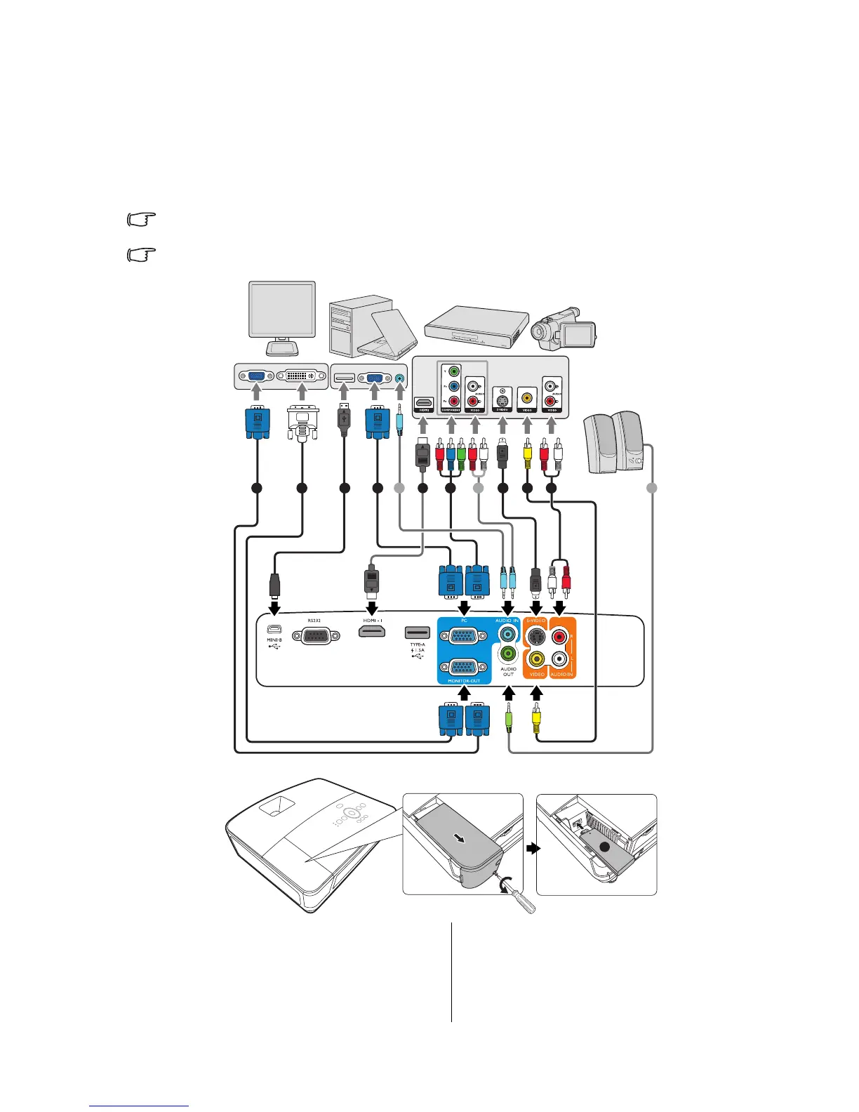 The connection illustrations below are for reference only. The rear connecting jacks available on the projector