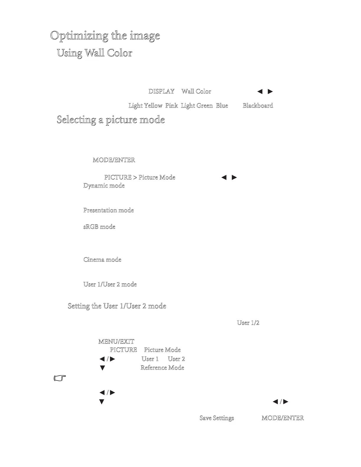 The projector is preset with several predefined picture modes so that you can choose one to
