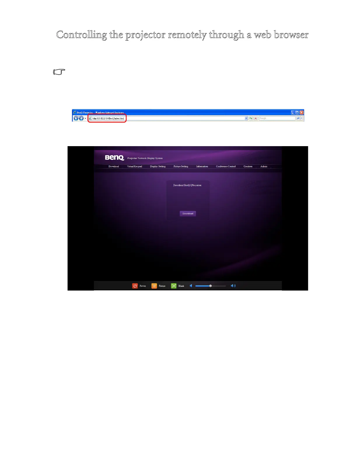 1. Enter the address of the projector in the address bar of your browser and press Enter.