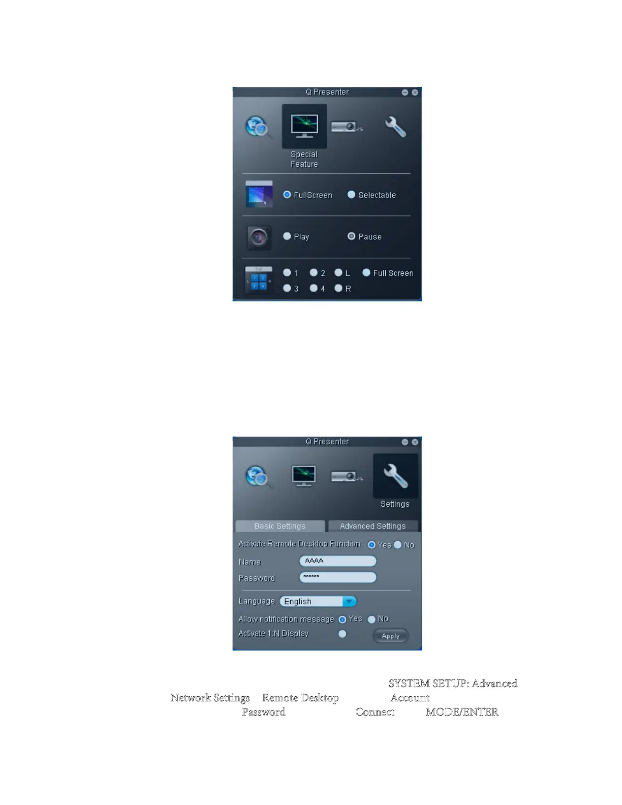 • To activate Remote Desktop function, click Yes. Type the name and password for