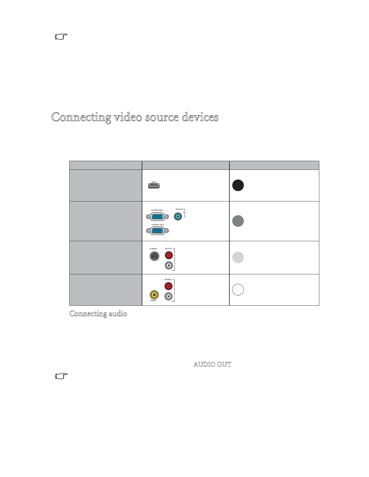 "Connecting audio" on page 18 for details.