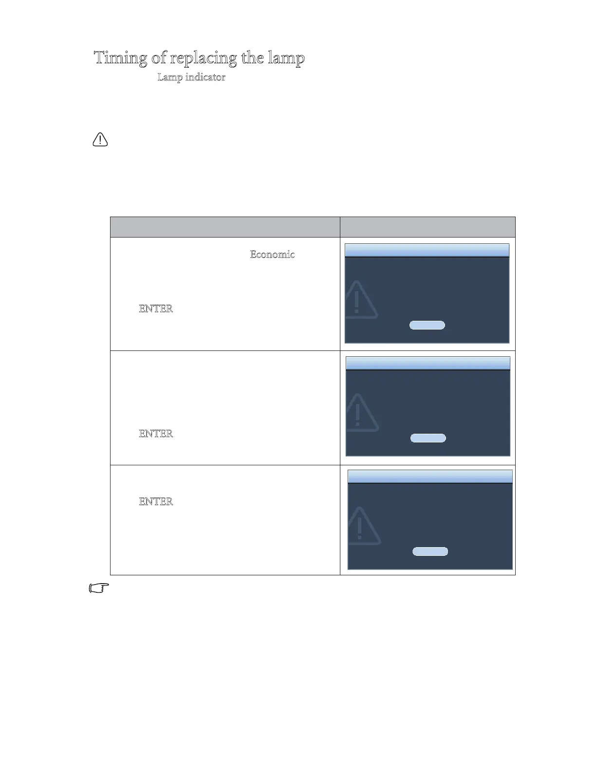 The following Lamp warning displays will remind you to change the lamp.