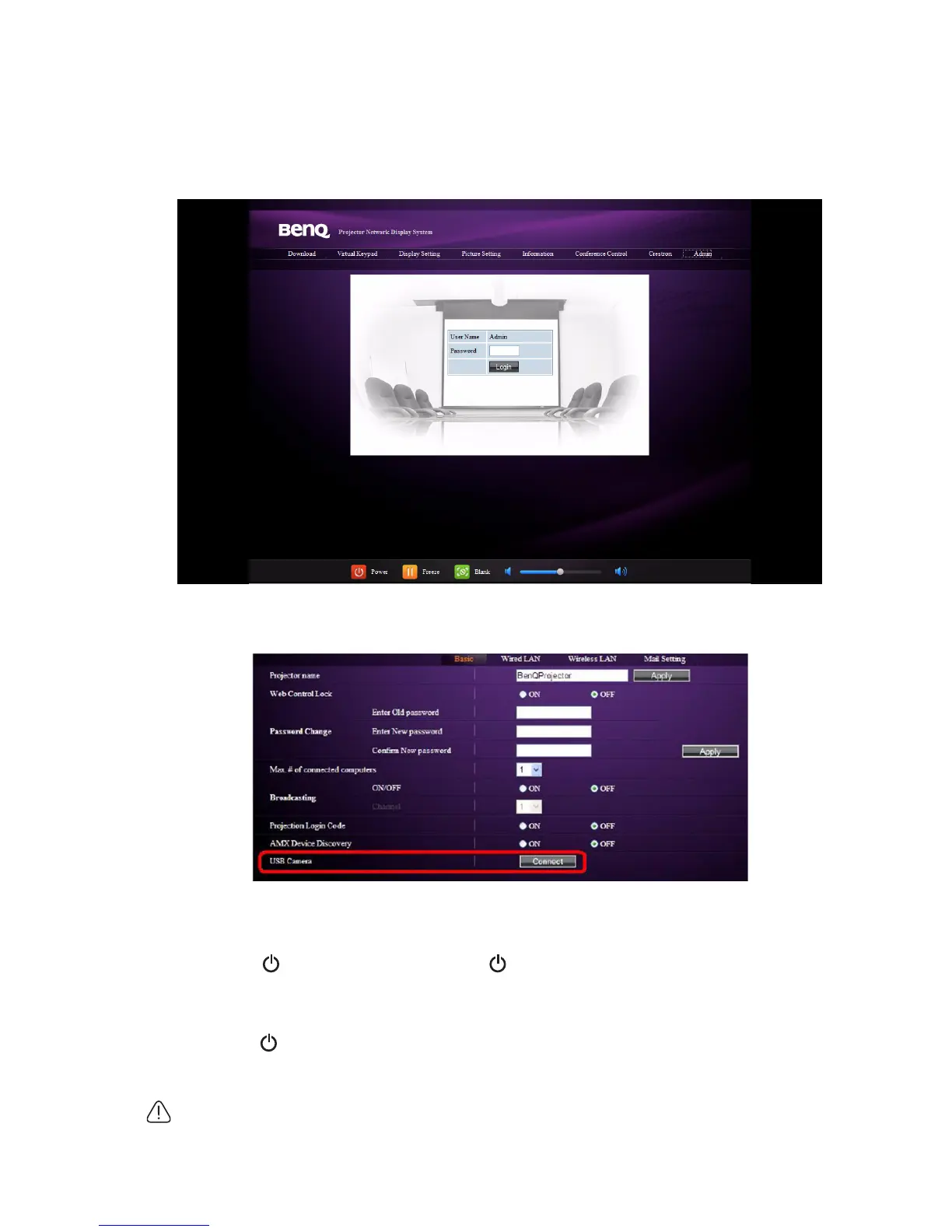 1. Plug the USB camera to the projector’s USB Type A port. For supported USB camera
