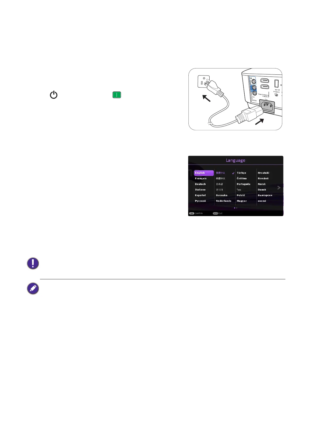 • If the projector is still hot from previous activity, it will run the cooling fan for approximately 90 seconds before