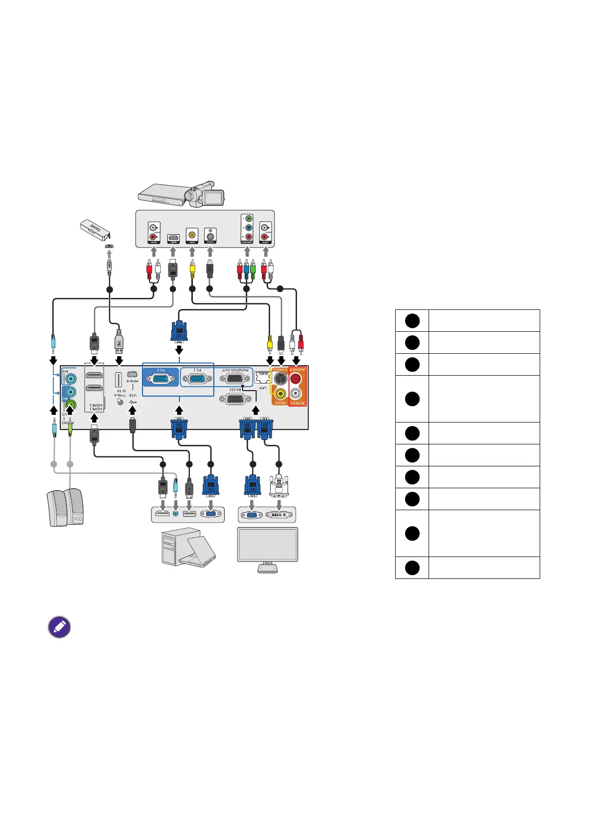• The connection illustrations are for reference only. The rear connecting jacks available on the projector vary with