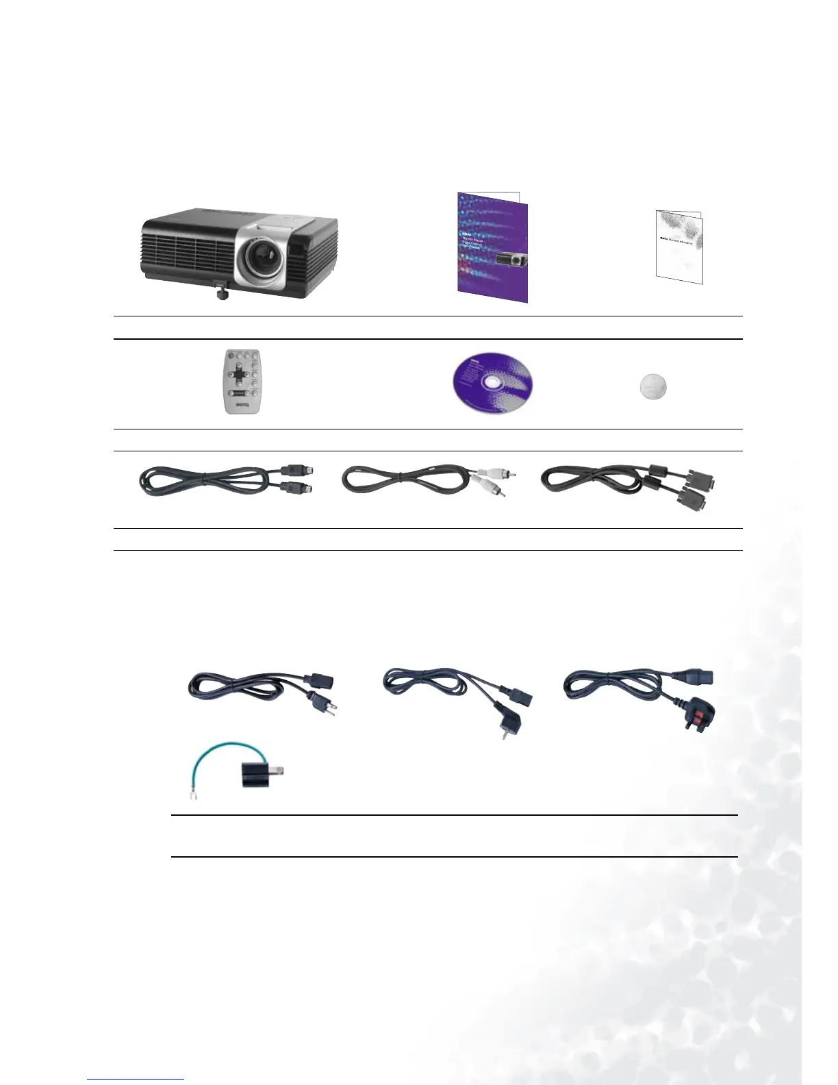 The projector is shipped with the cables required for connection to a PC and to video equip-