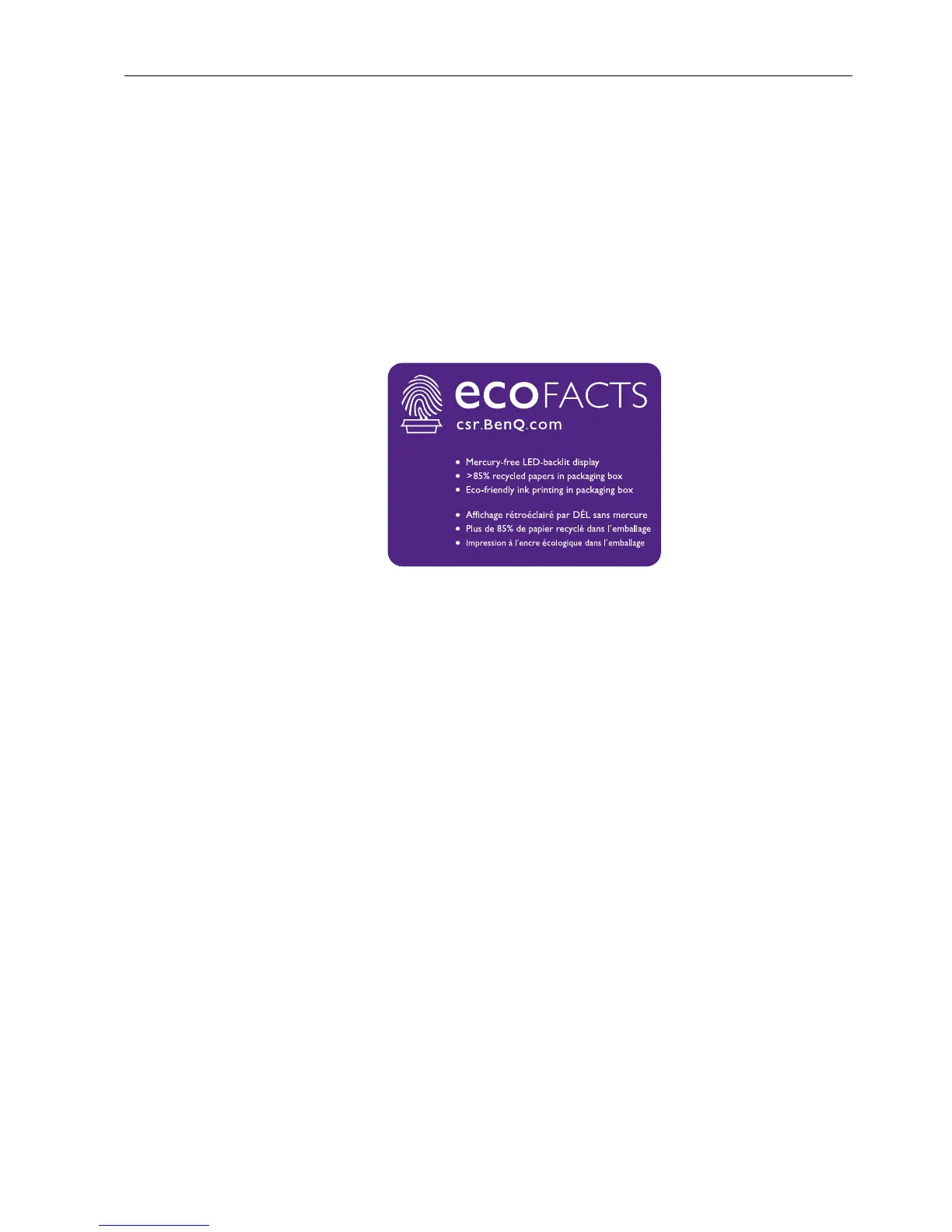 transportation, using and disposal of the products. BenQ ecoFACTS label lists key eco-