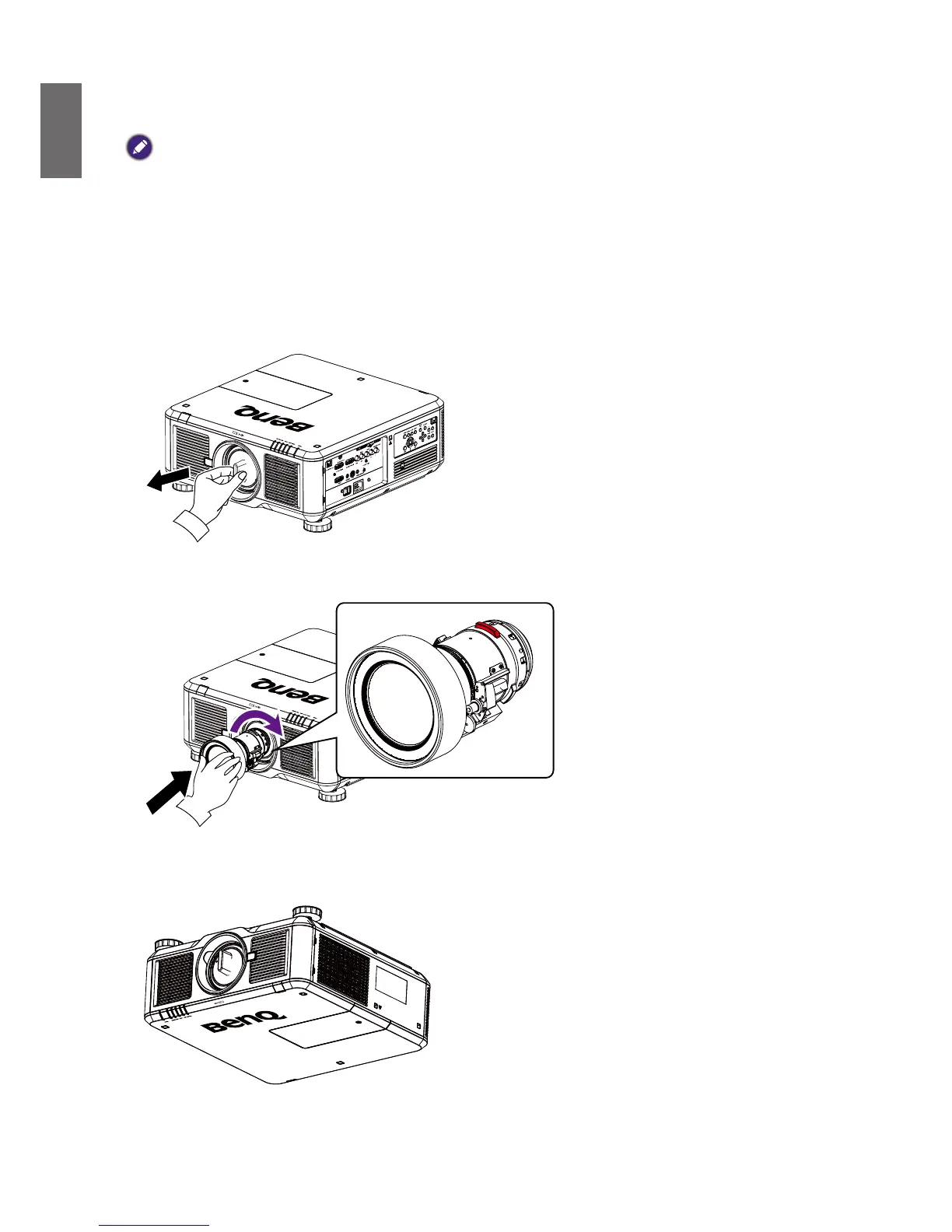When installing the lens into the projector, be sure to remove the lens cap from the back of the optional lens before