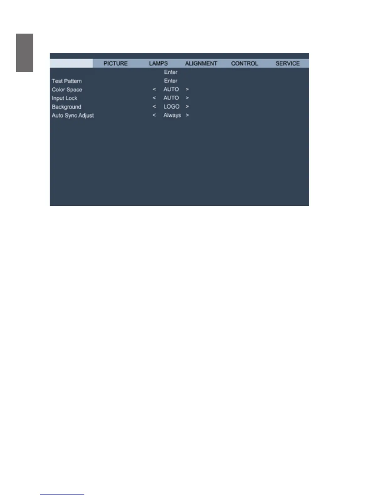 The projector features a set of test patterns for installation and adjustment. Select the test