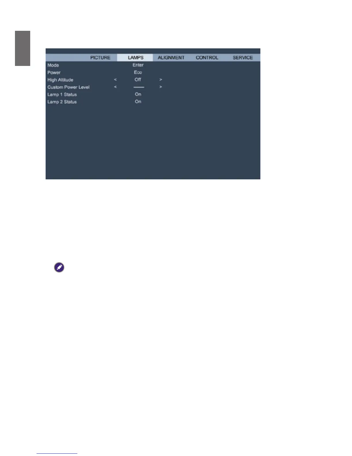 Lamp 1: Select lamp1 only for projection. The projector switches to lamp 2 if lamp 1 is