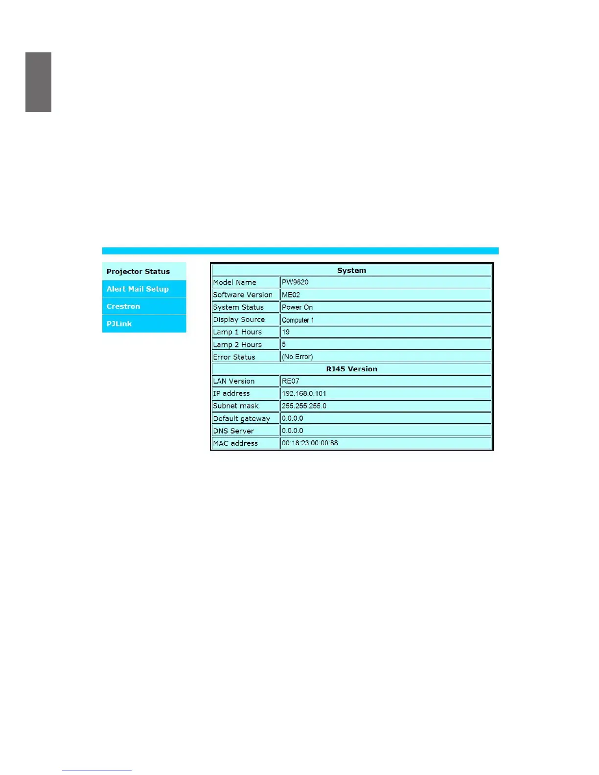Open a web browser and enter the projector's IP address. Its home page with four options will