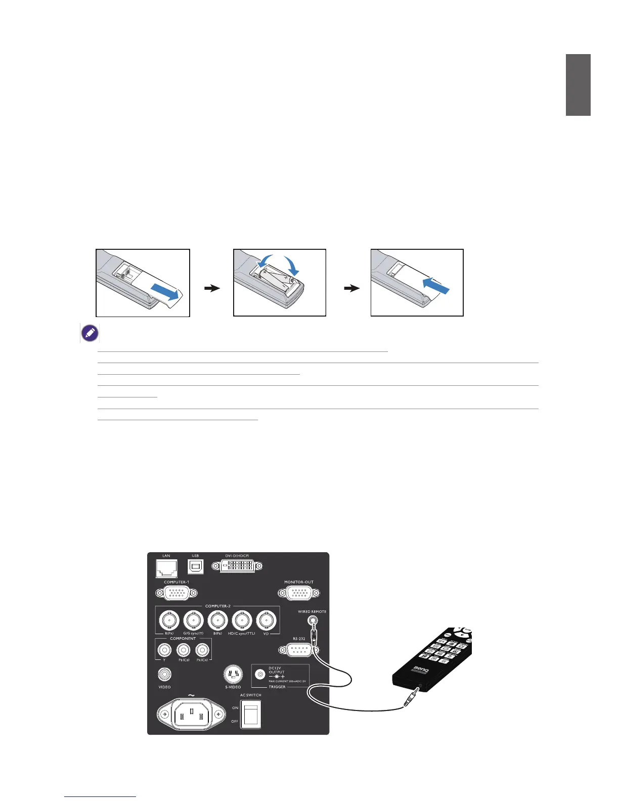 • If the remote control will not be used for an extended period of time, remove the batteries to avoid damage to