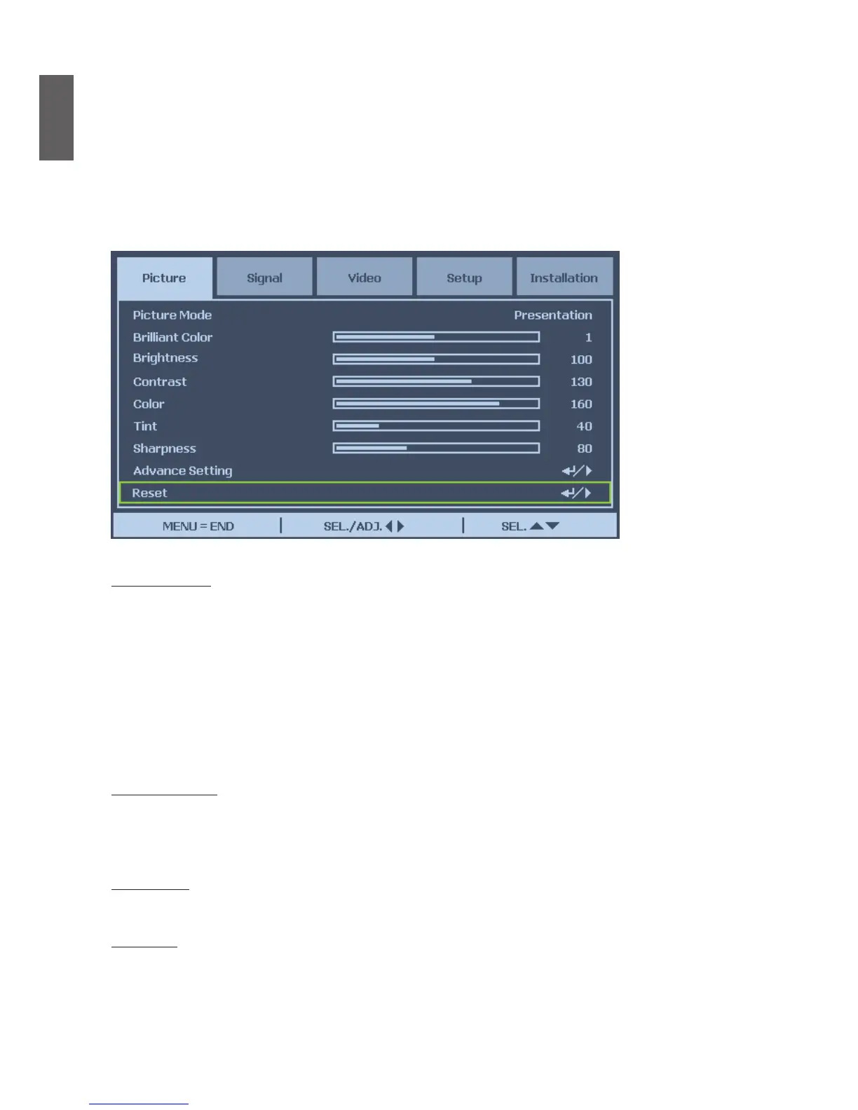 The pre-dened picture mode settings can be altered via the available items shown in the Picture