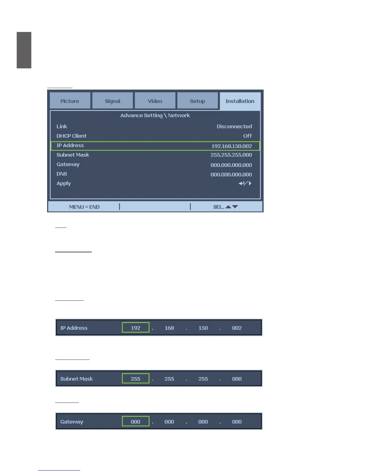 On: Enable conguration parameters for IP Address, Subnet Mask, Gateway and DNS