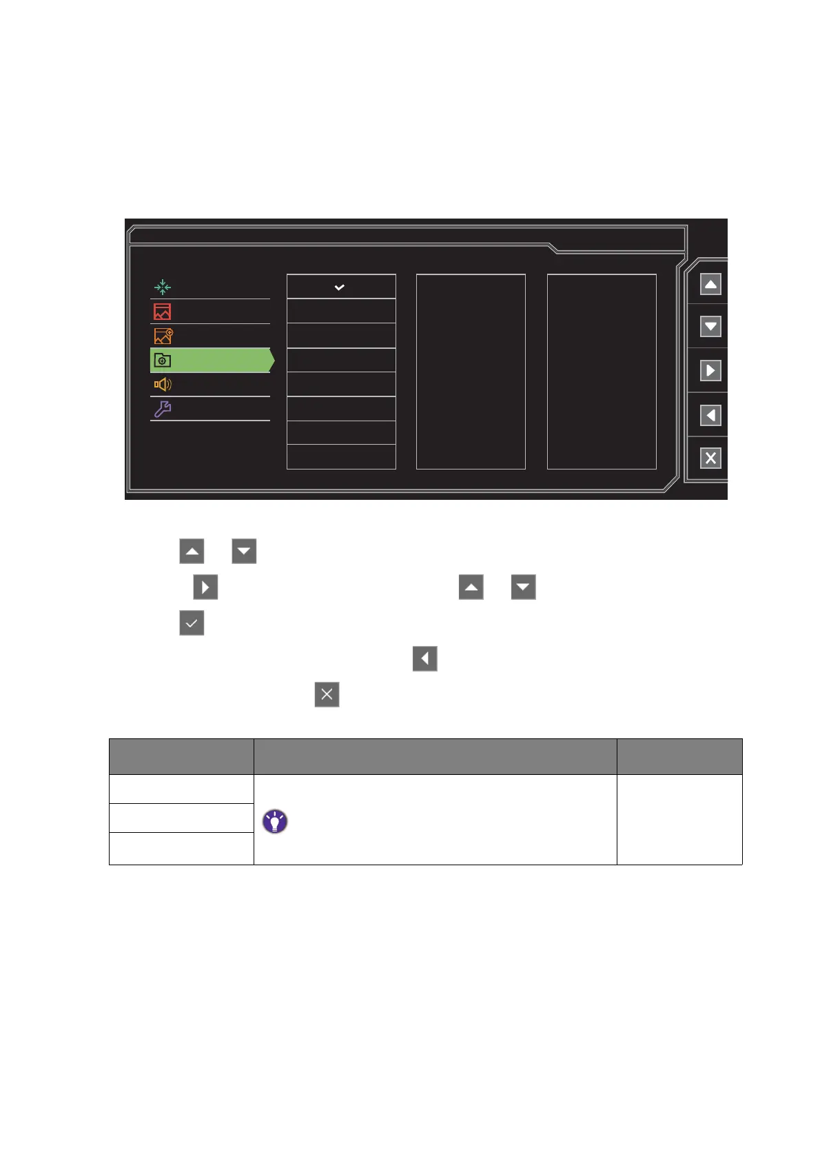 3. Select to go to a sub menu, and then use or to select a menu item.
