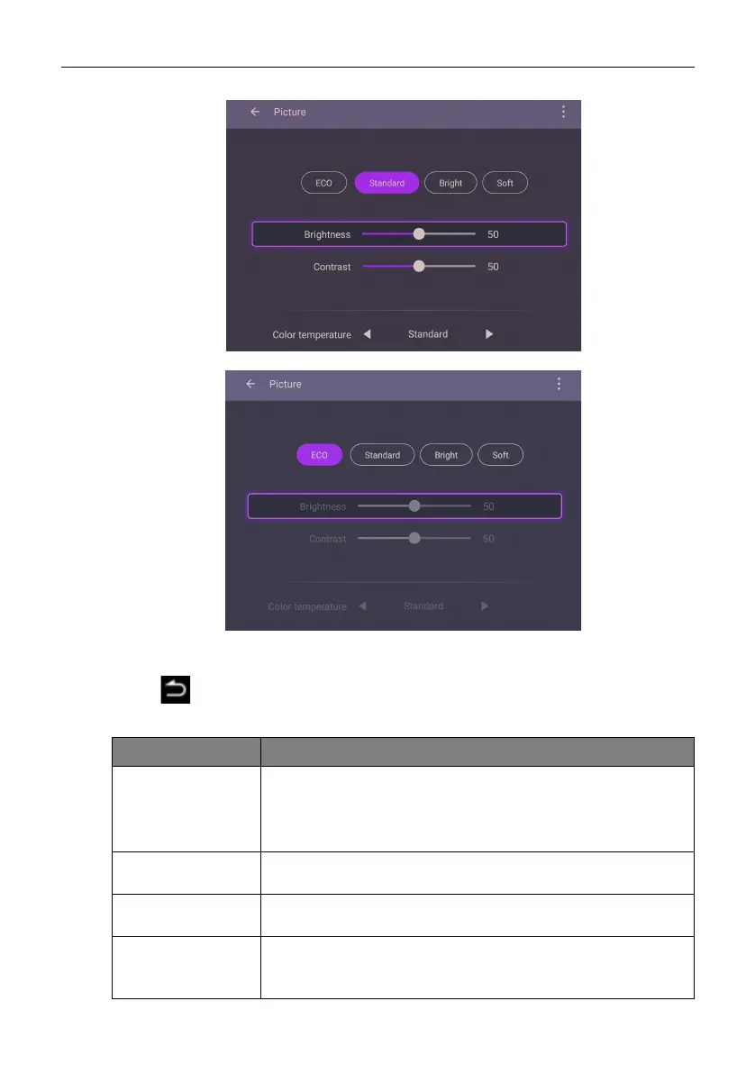• Under Eco mode, Brightness level, Contrast, and Color