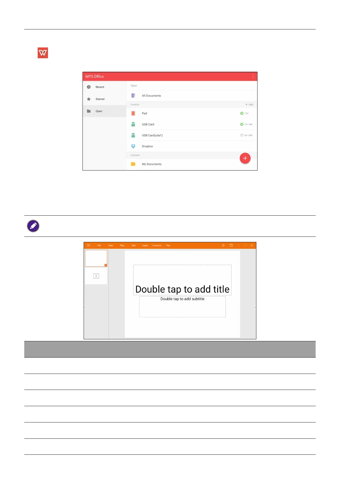 1. Tap Open on the left panel to browse and open a file located in either the display’s