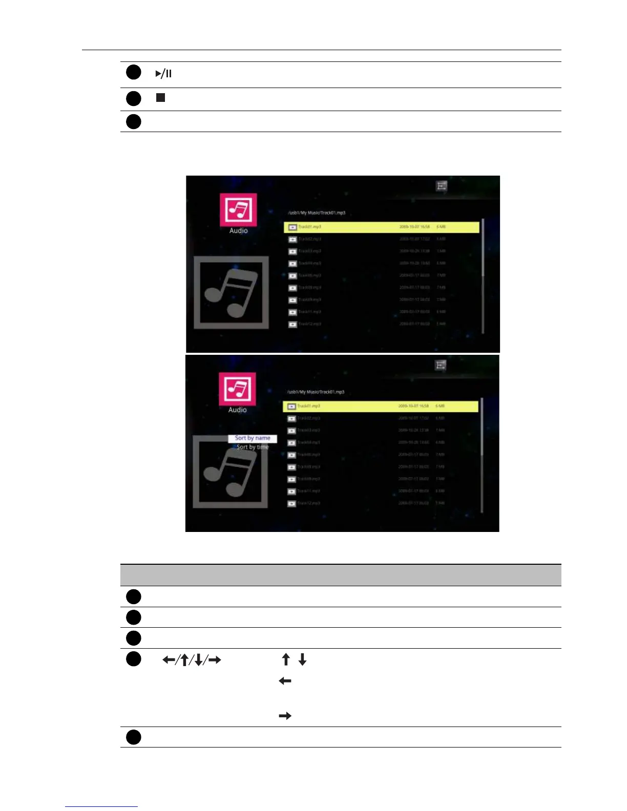 • Audio: Lists all supported files. Select the audio you want to play and perform the