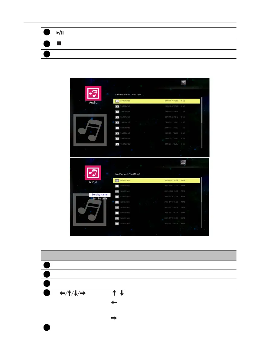 • Audio: Lists all supported files. Select the audio you want to play and perform the