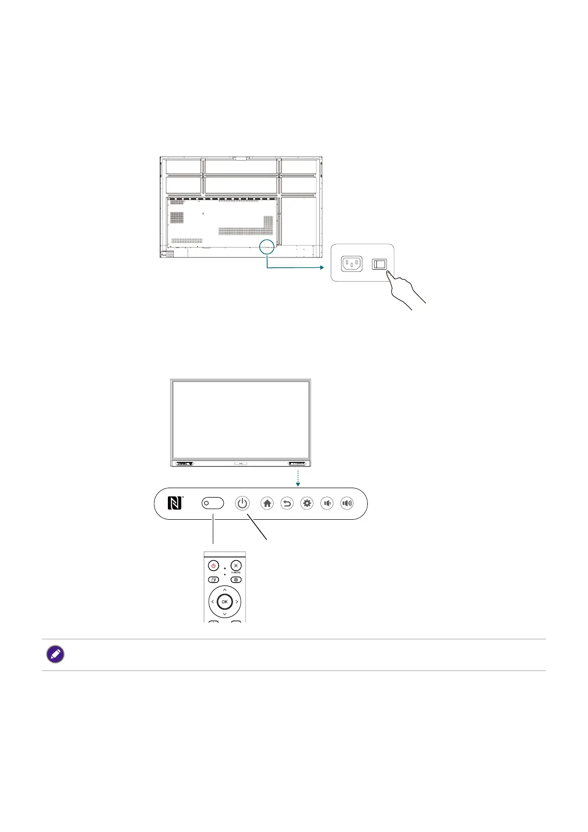 • To turn on the display, press the power button on the control panel or on the remote control.