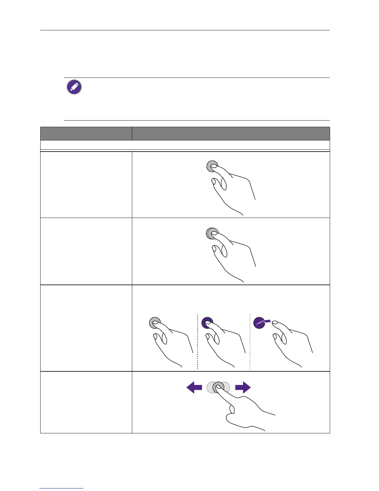 8*. The following table shows a list of gestures you can use on the touch screen.