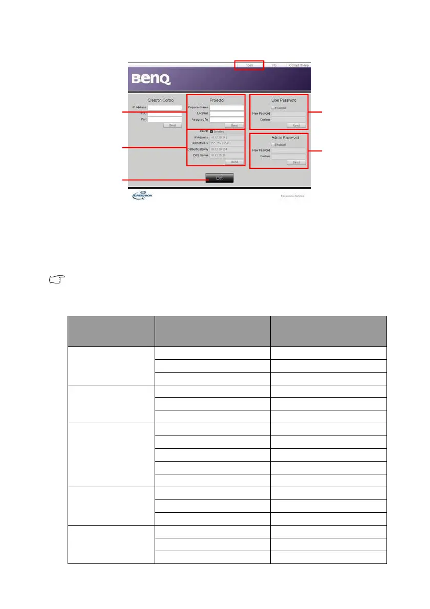 The tools page allows you to manage the projector, configure the LAN control settings and