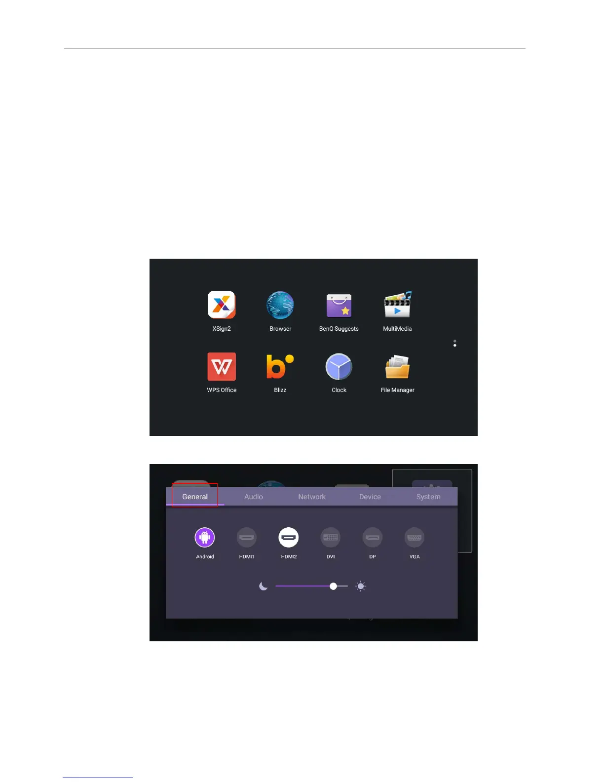 • Under General, you can select a desired input source and adjust backlight. Refer to