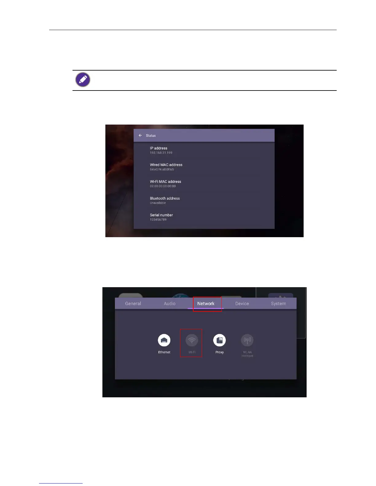On the home screen, go to Setting > System > About > Status. If there is no IP