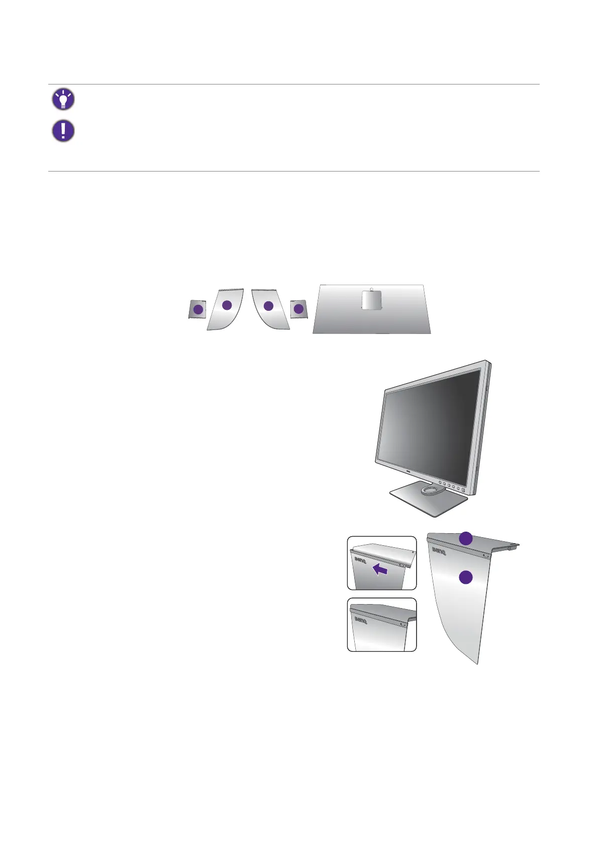 • Please be careful to prevent damage to the shading hood and the monitor. Different pieces of shading hood are