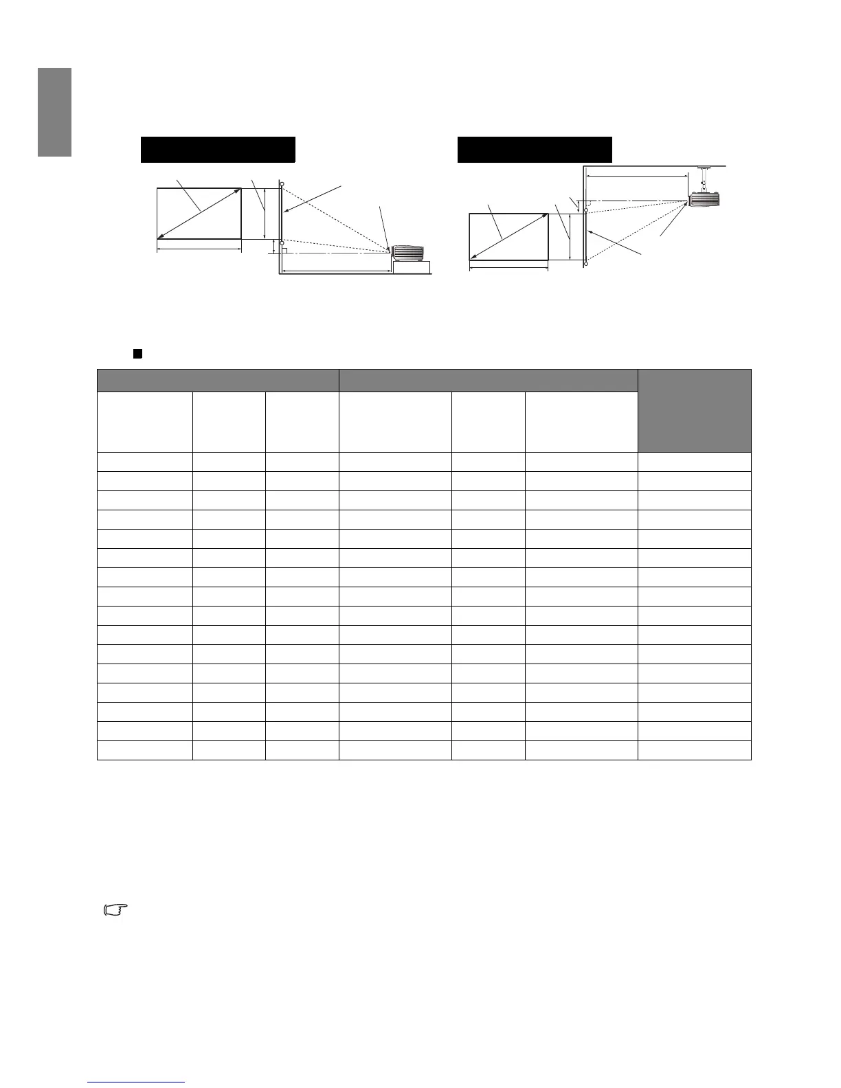 Screen dimensions Projection distance <D> [cm]