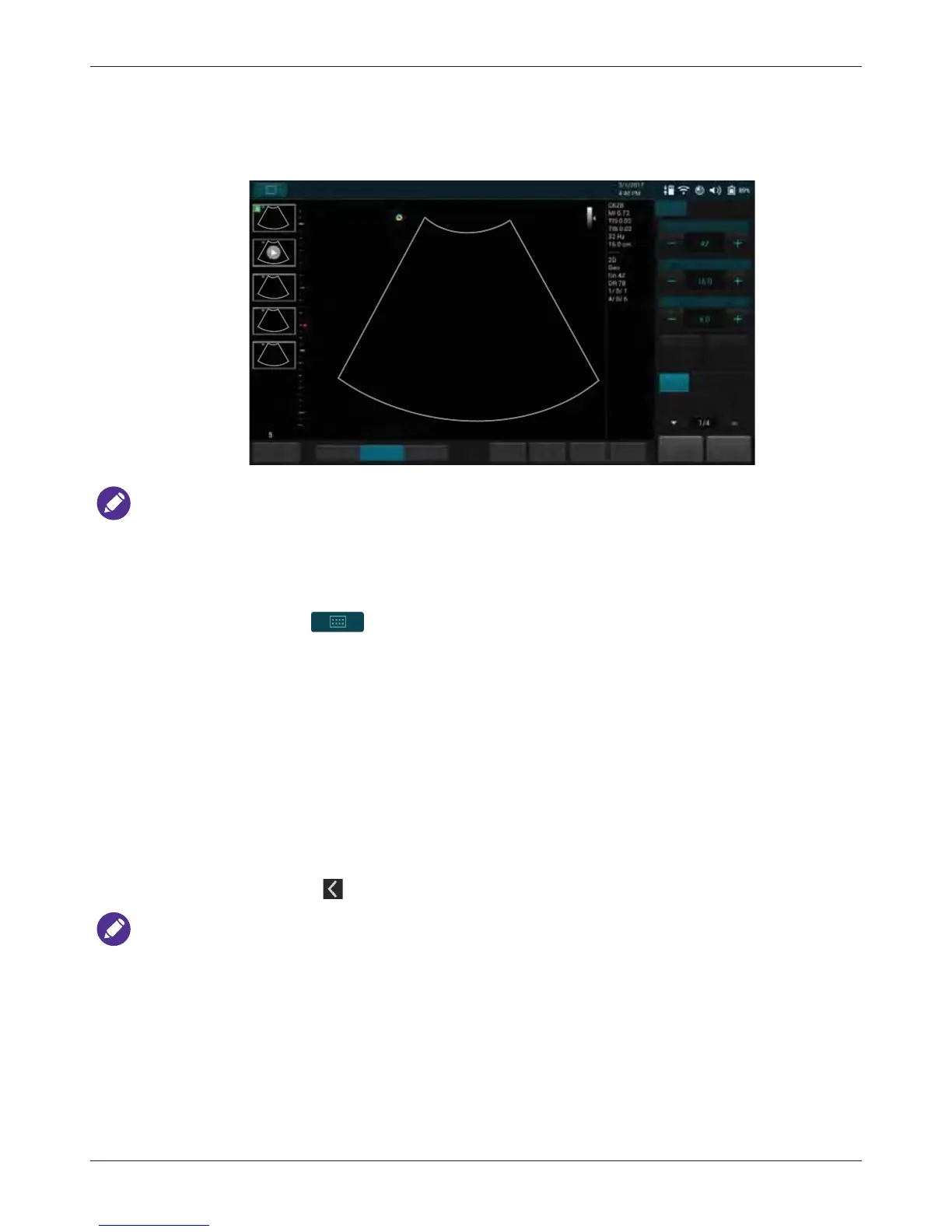 • If a transducer is connected, the system enters the real-time B-mode imaging screen (default).