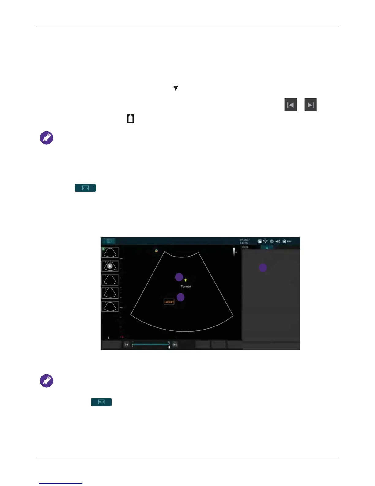 On the real-time or frozen imaging screen, touch Annot to add annotations to the ultrasound images