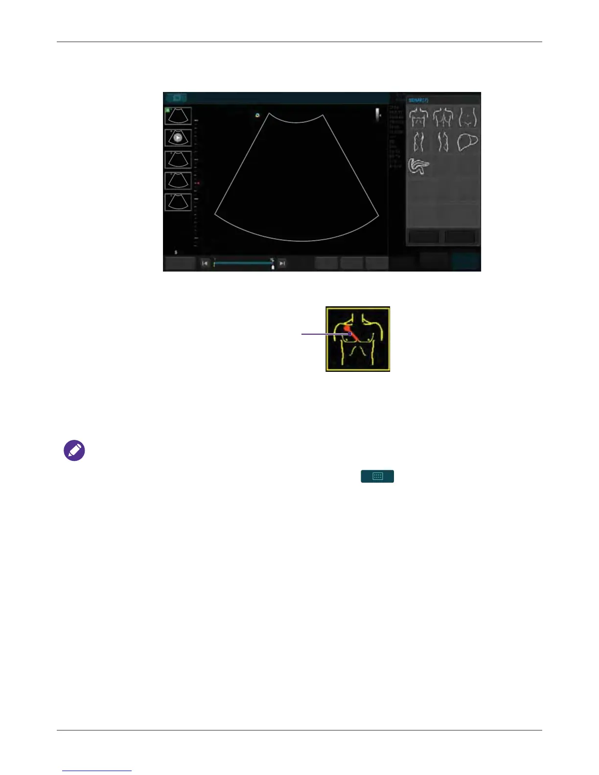 2. A pictogram of the default body mark with a transducer indicator displays on the image. If you