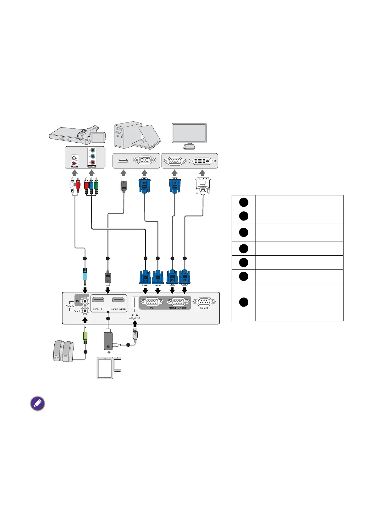 • The connection illustrations are for reference only. The rear connecting jacks available on the projector vary with