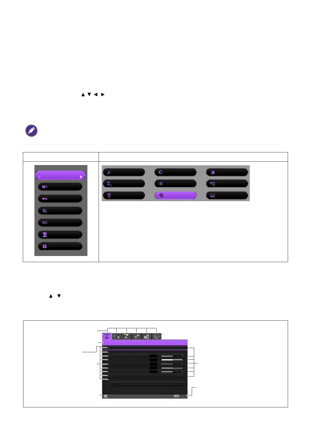 • Use the arrow keys ( / / / ) on the projector or remote control to move through the menu items.