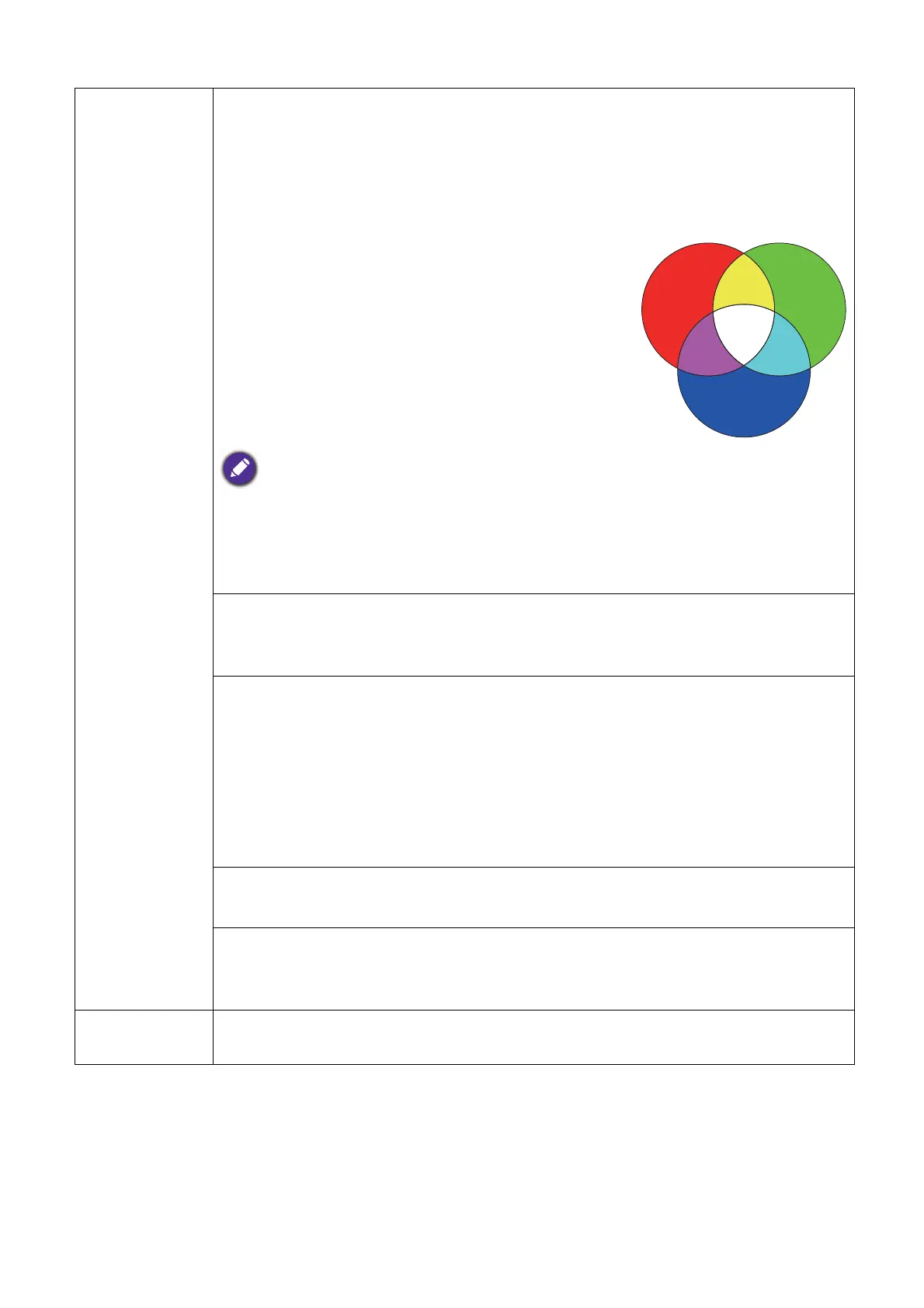• Primary Color: Selects a color from among R (Red), G (Green), B (Blue), C (Cyan), M