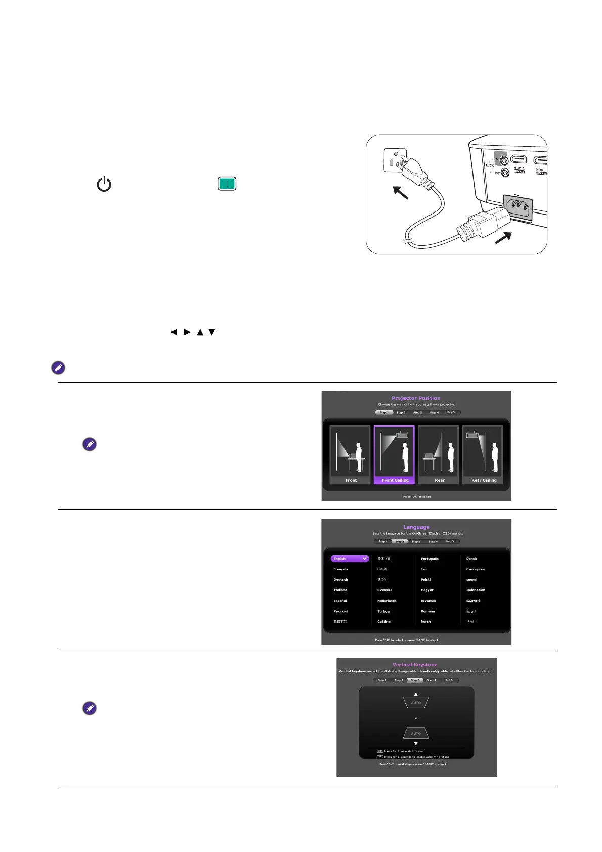 3. If this is the first time you turn on the projector, the setup wizard appears to guide you through