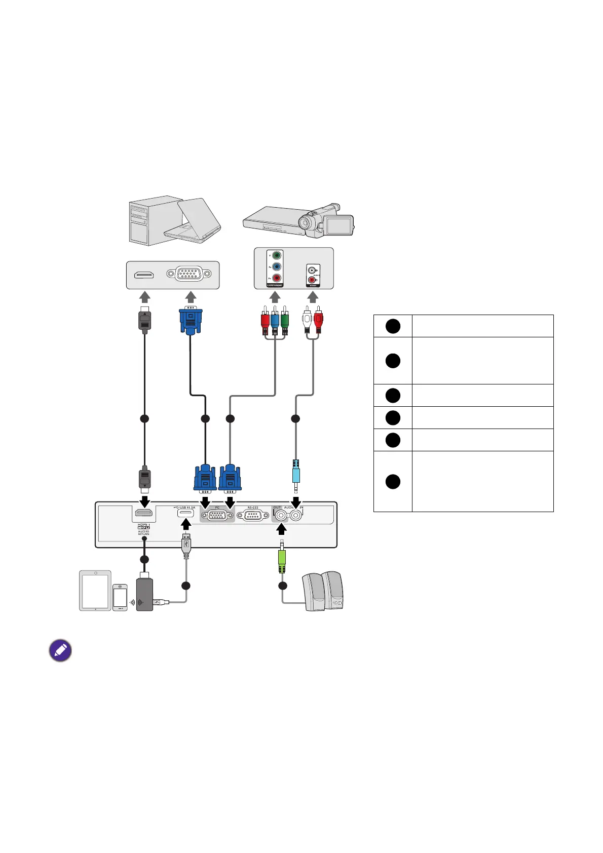 • The connection illustrations are for reference only. The rear connecting jacks available on the projector vary with