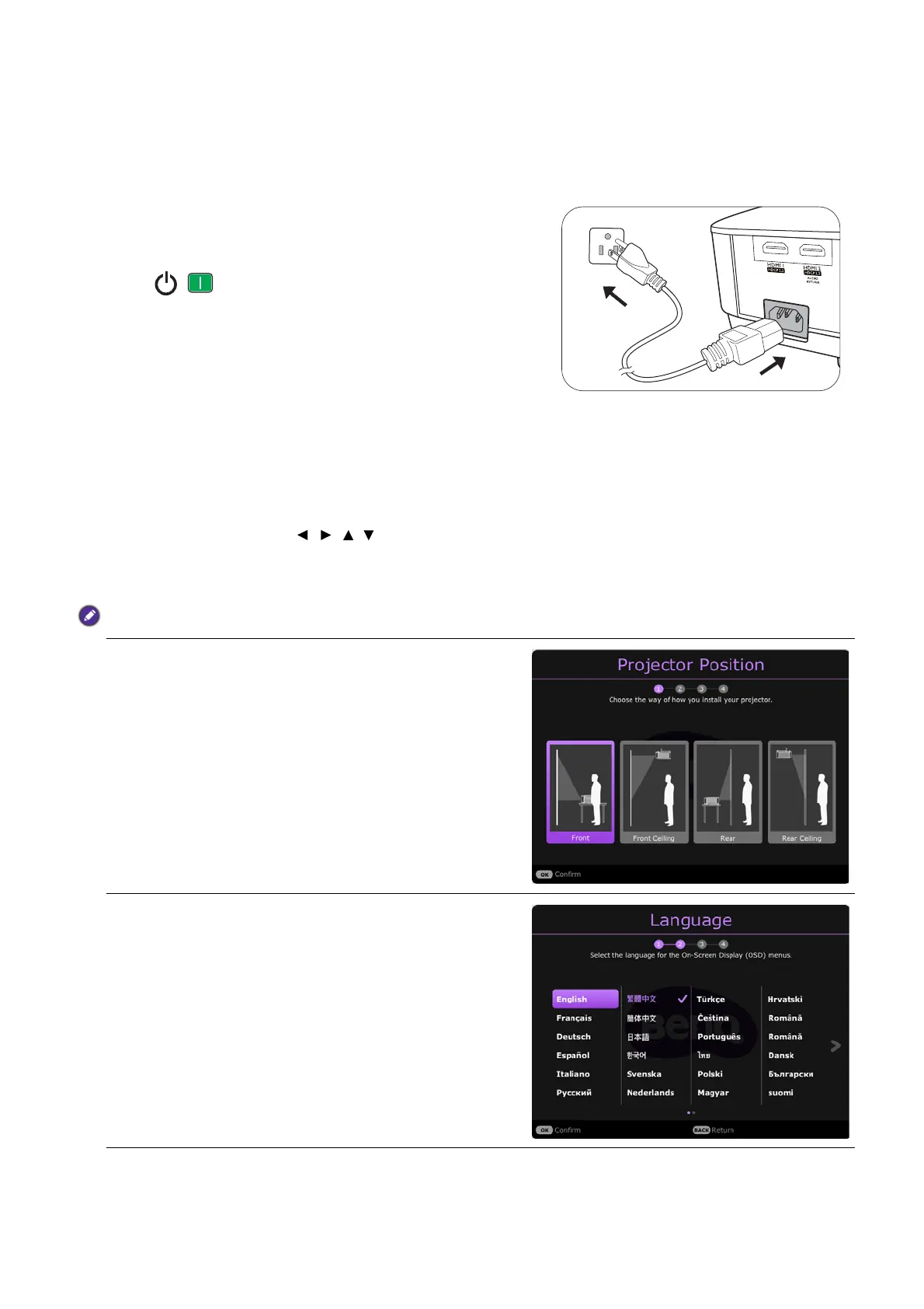 3. If this is the first time you turn on the projector, the setup wizard appears to guide you