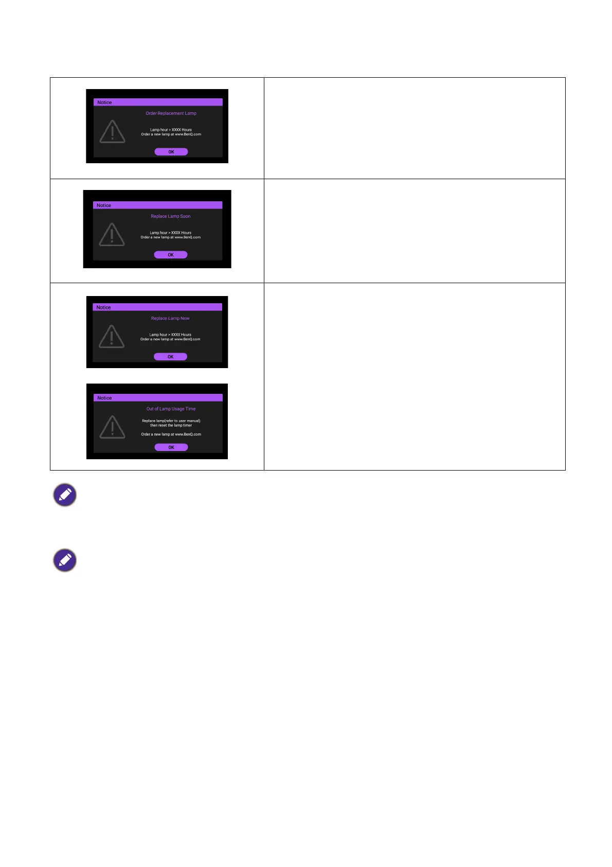 The following Lamp warning displays will remind you to change the lamp.