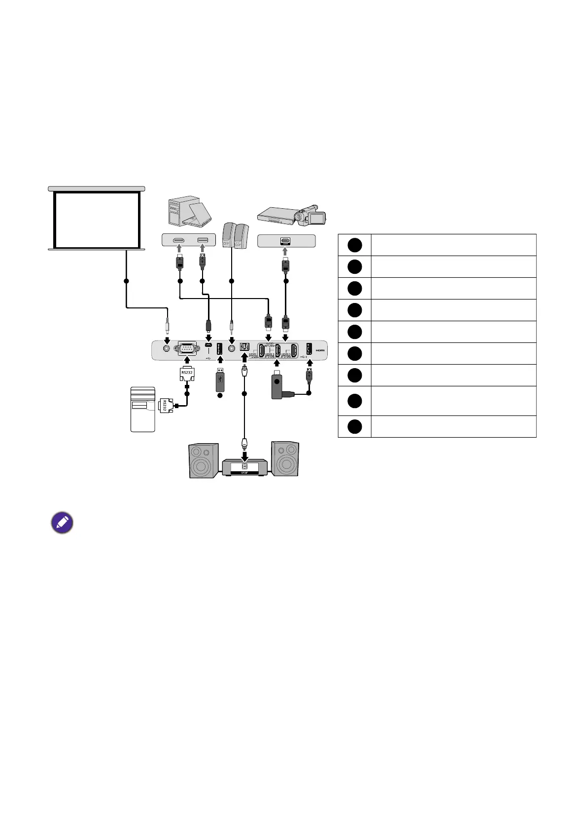 • The connection illustrations are for reference only. The rear connecting jacks available on the projector vary with