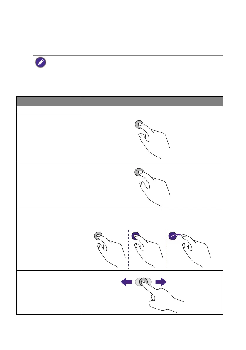The following table shows a list of gestures you can use on the touch screen.
