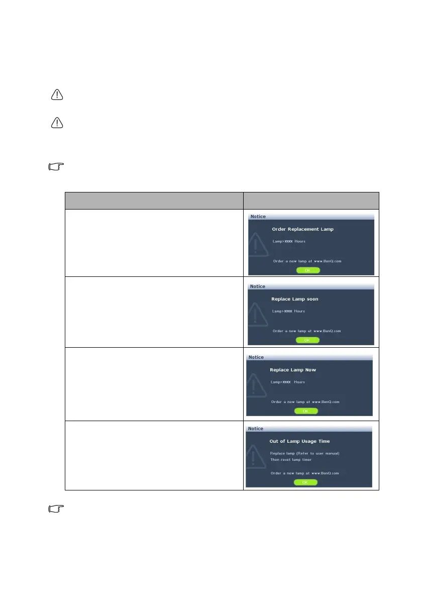 The following lamp warning displays will remind you to change the lamp.